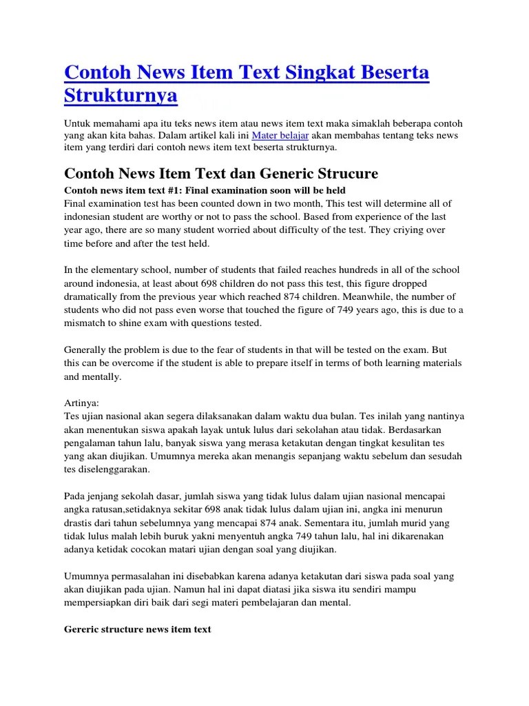 Contoh news item text baru dalam bahasa inggris dilengkapi pembahasa generic structure. 15 contoh soal news item text dan kunci jawaban terbaru paja tapuih. 50 contoh soal news item text dan . Contoh soal news item beserta kunci jawaban & pembahasannya. Terbanyak kumpulan contoh soal hots bahasa inggris disertai jawaban.